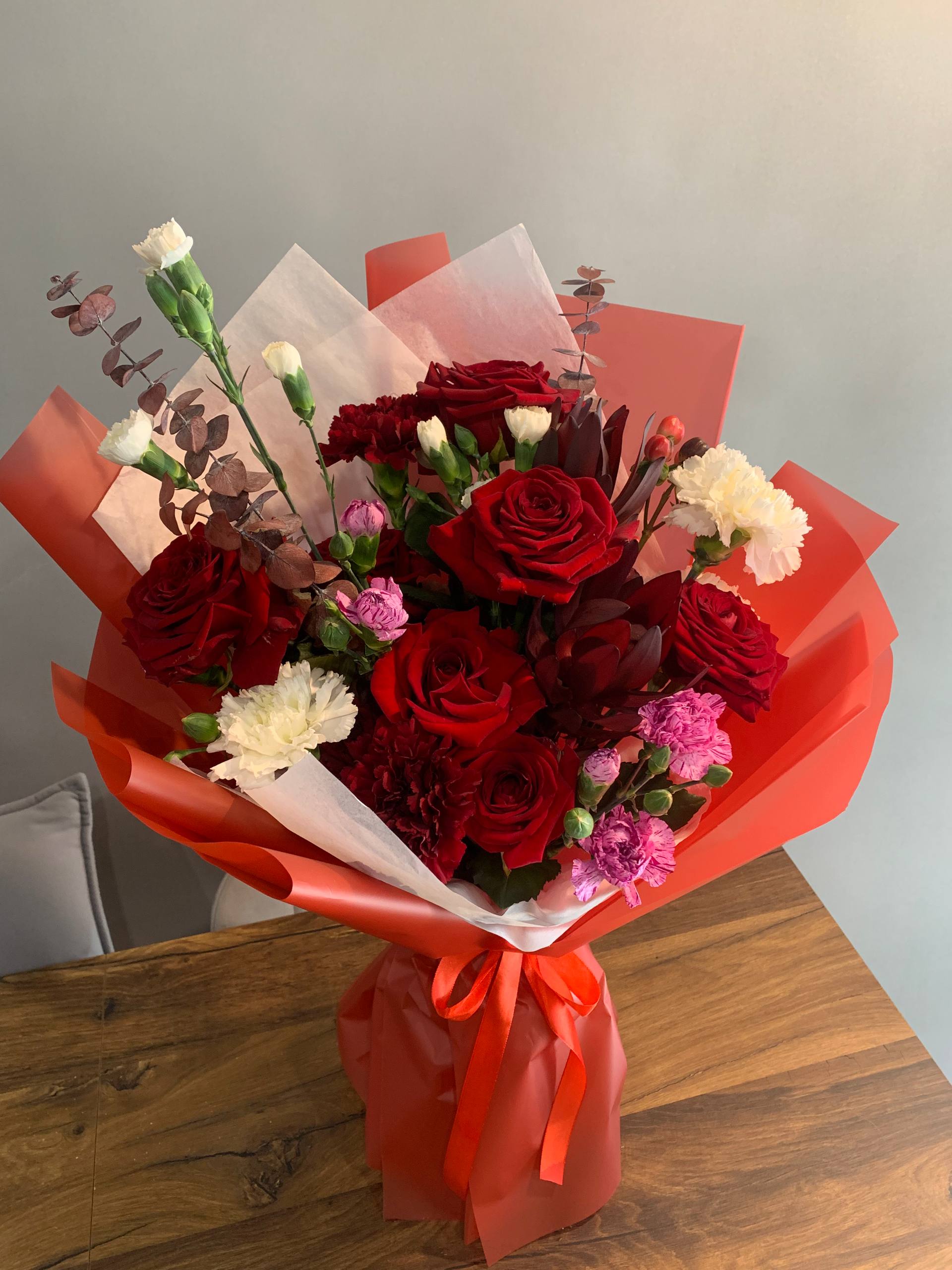 Состав: роза Red Naomi, диантус одноголовый, диантус кустовой, эвкалипт.