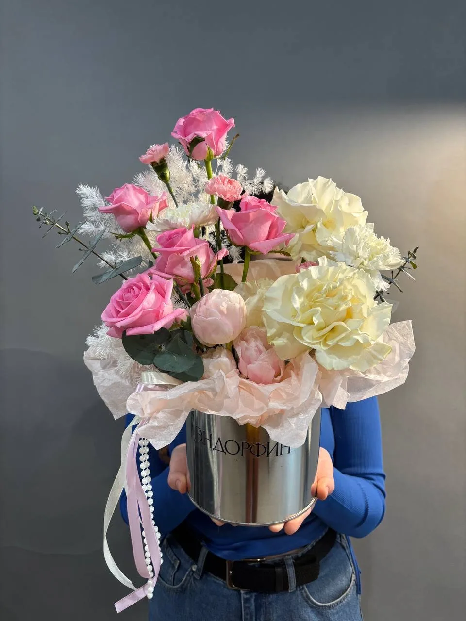 Состав: роза Revival, французская роза, диантус, диантус кустовой, эвкалипт, стабилизированный аспарагус, фирменная металлическая банка "ЭНДОРФИН"