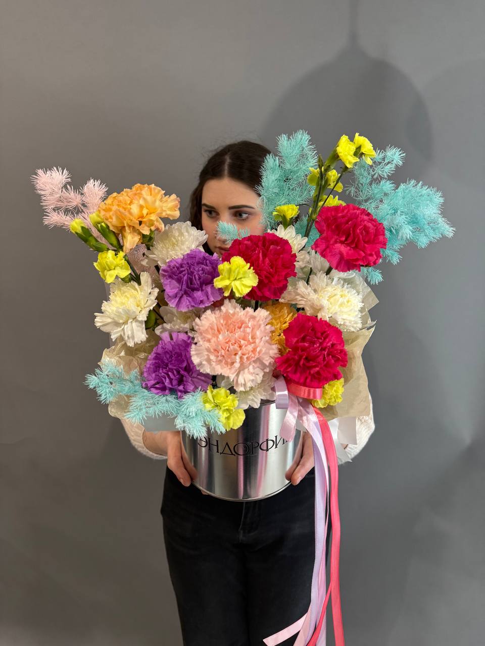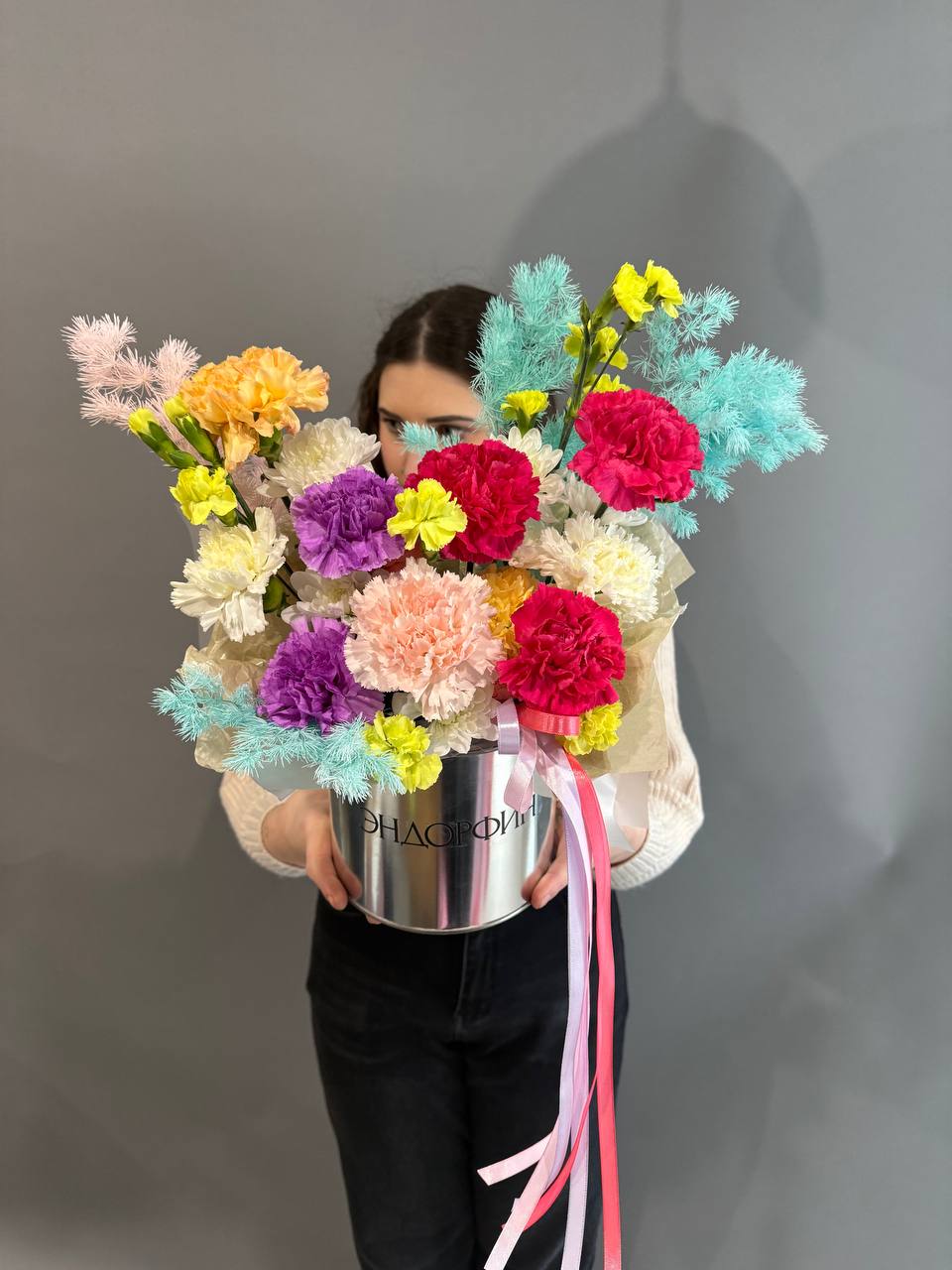 Состав: диантус одноголовый, диантус кустовой, аспарагус, фирменная металлическая банка «ЭНДОРФИН».